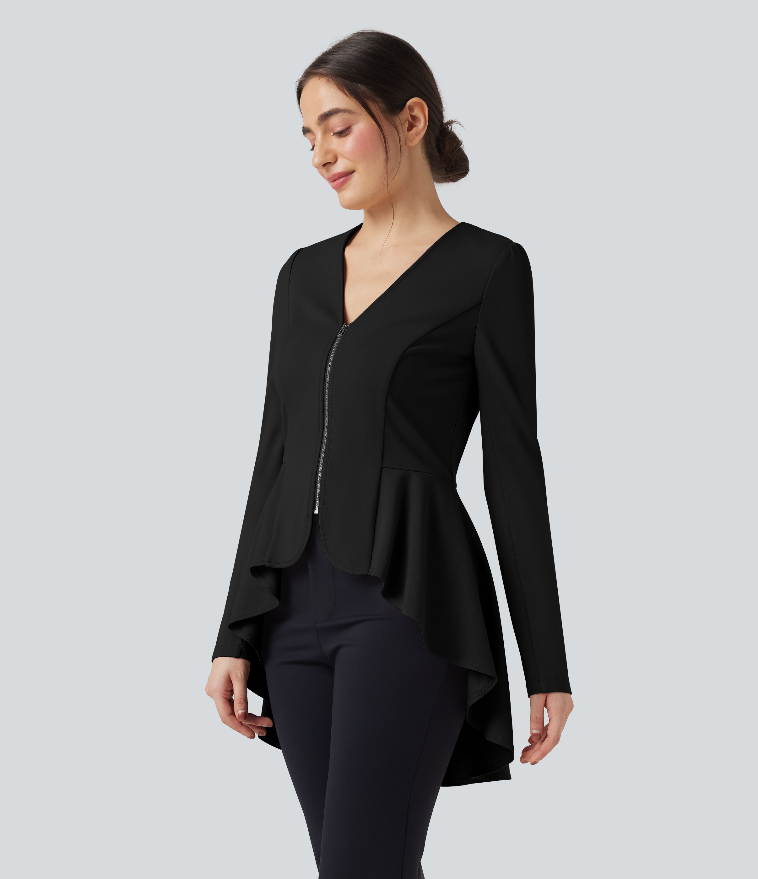 V Neck Long Sleeve Ruffe Hem High Low Work Coat