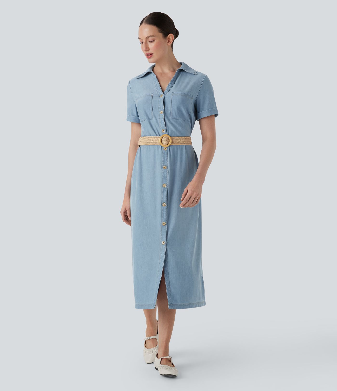 Halara Flex™ Short Sleeve Denim Midi Casual Dress with Pockets
