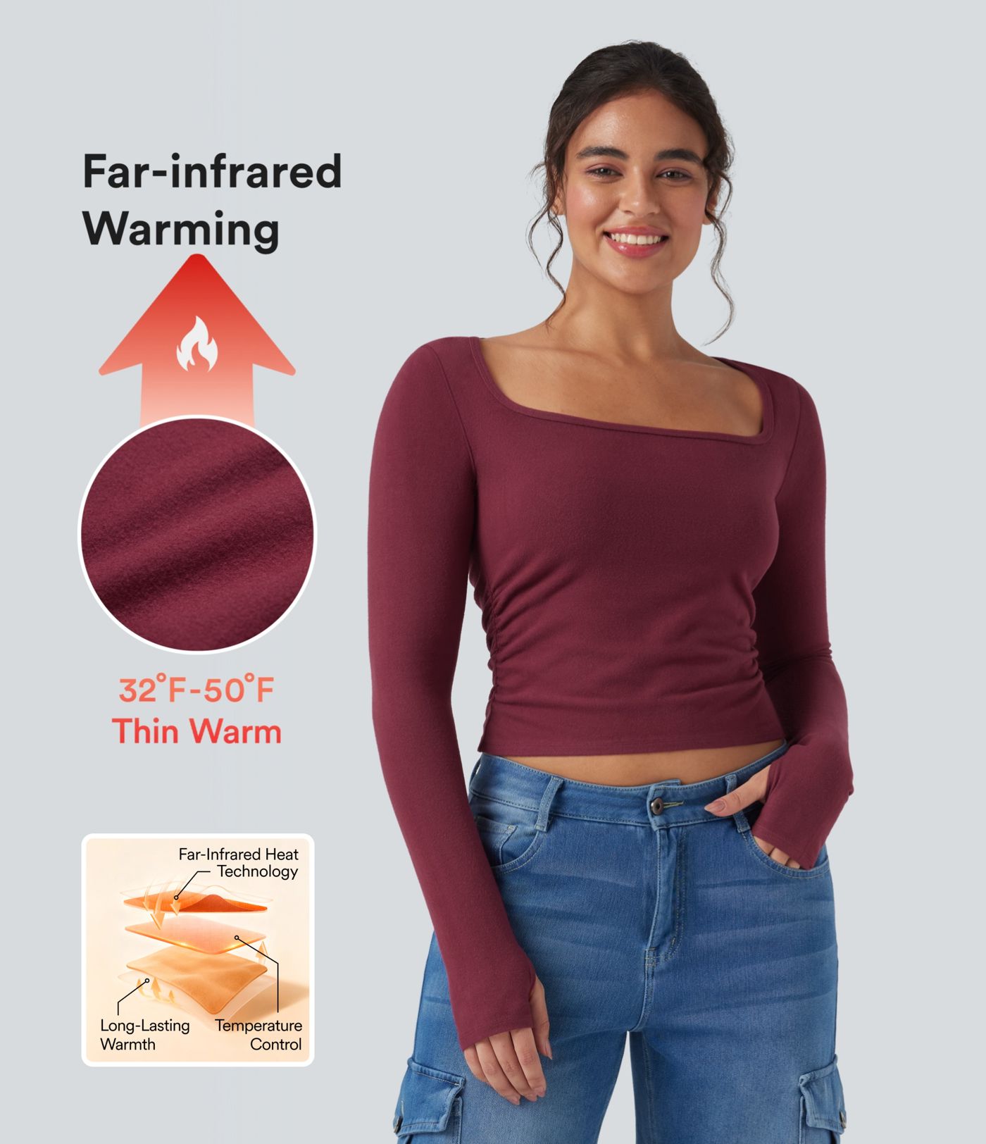 Halara HeatCore U-Neck Long Sleeve Thumb Holes Ruched Slim Casual Warming Top