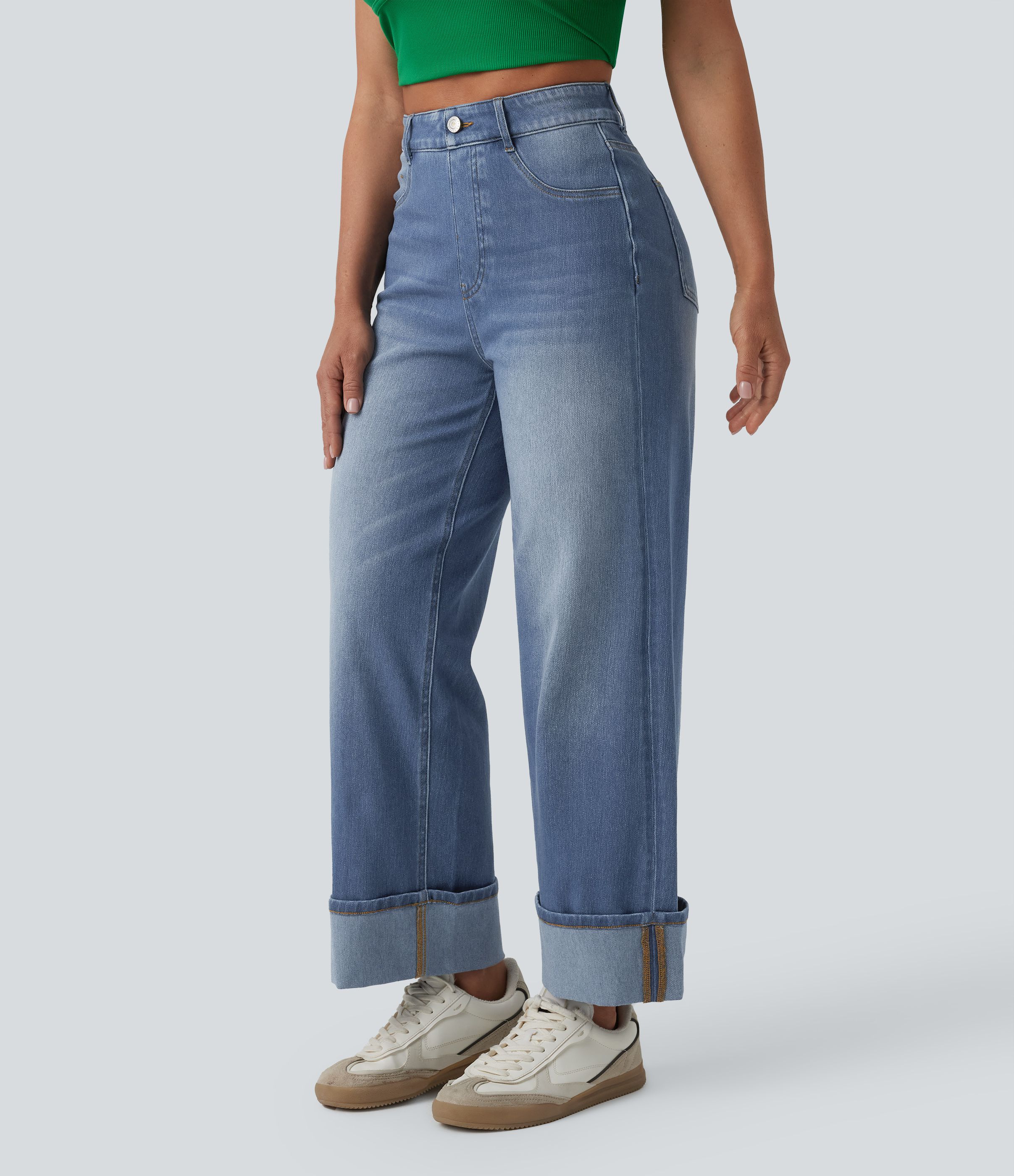Halara Flex™ High Waisted Tummy Control Rolled Hem Wide Leg Washed Casual Jeans with Pockets