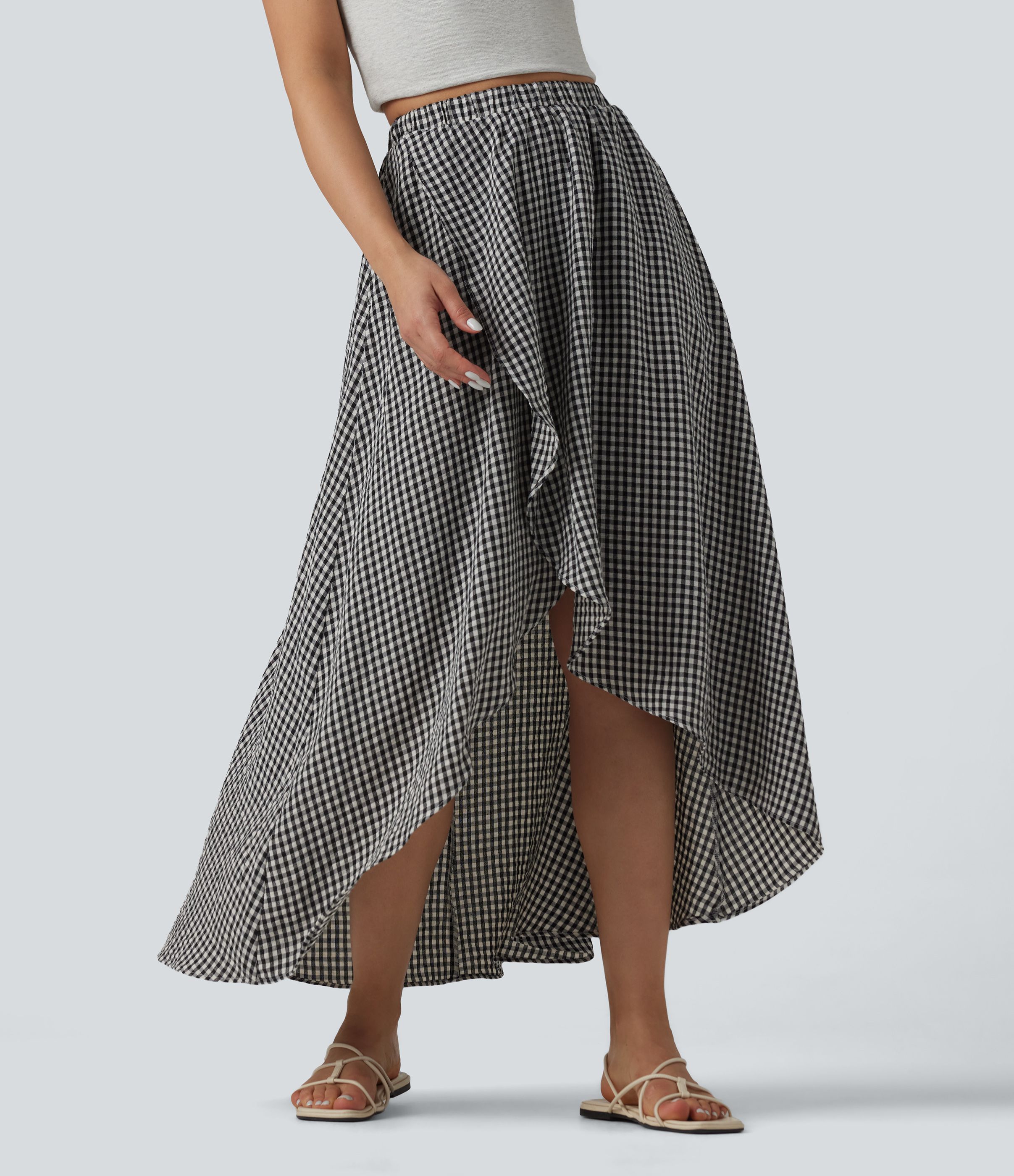 Magas derekú, magas‑alacsony (high‑low) szegélyű, kockás, lágy esésű midi szoknya, lenhatású, hétköznapi, zsebekkel