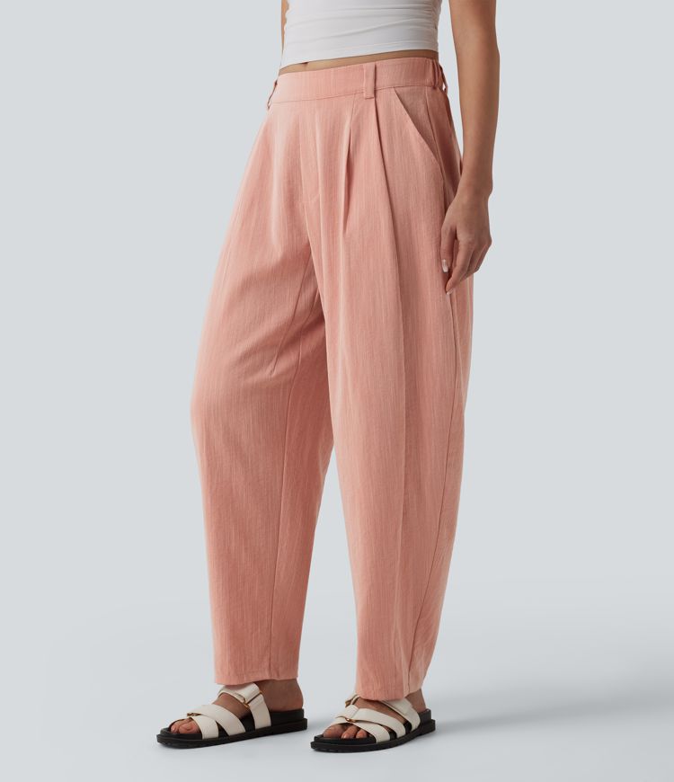 Mid Rise Barrel Leg Casual Linen-Feel Pants with Pockets