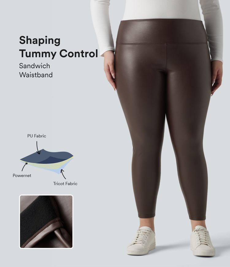 Plus Size High Waisted Tummy Control Stretchy PU Fleece 7/8 Skinny Casual Leggings with Pockets