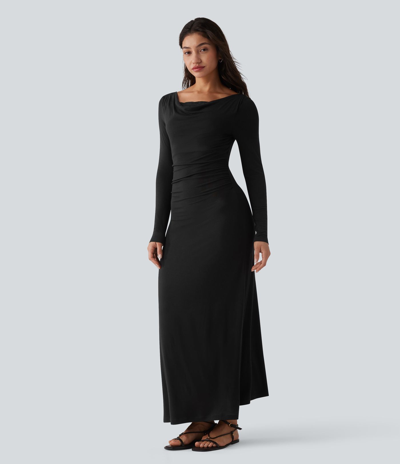 Ribbed Cowl Neck Contrast Lace Long Sleeve Maxi Casual Dress