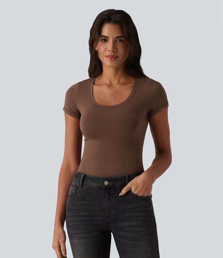 T-shirt casual de algodão com decote em U e mangas curtas