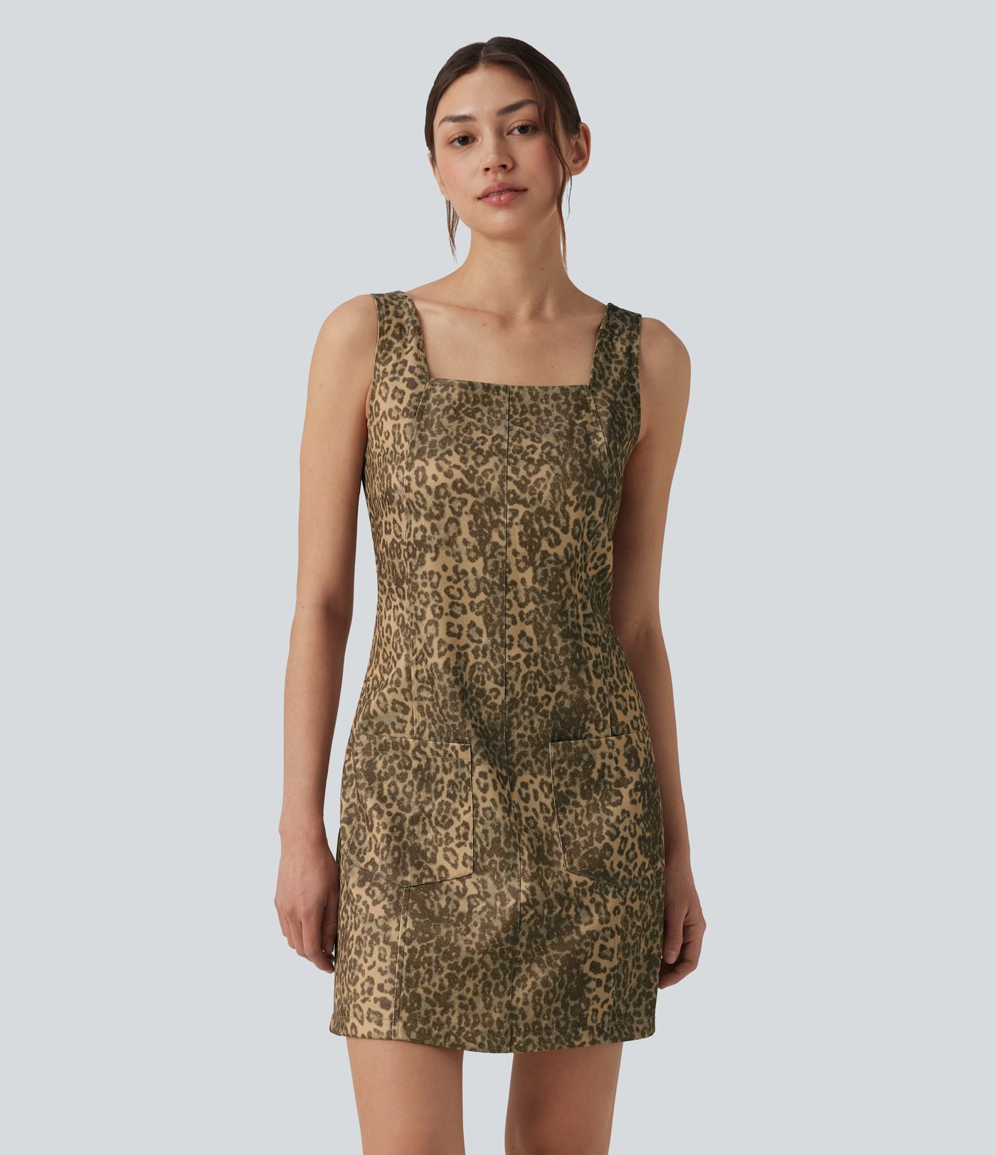 Square Neck Leopard Print Mini Casual Dress with Pockets