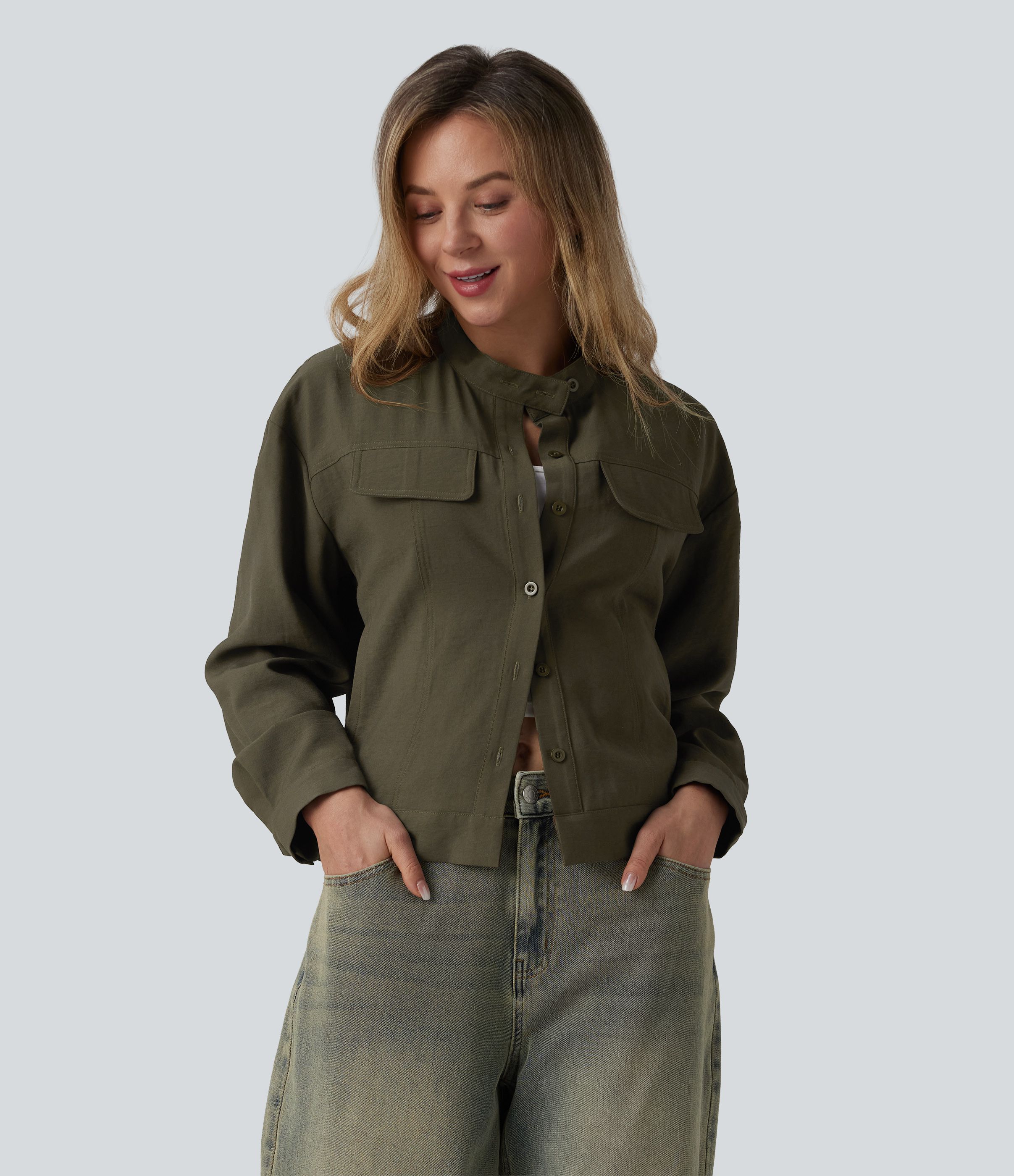 Stand Collar Long Sleeve Casual Cargo Jacket with Pockets