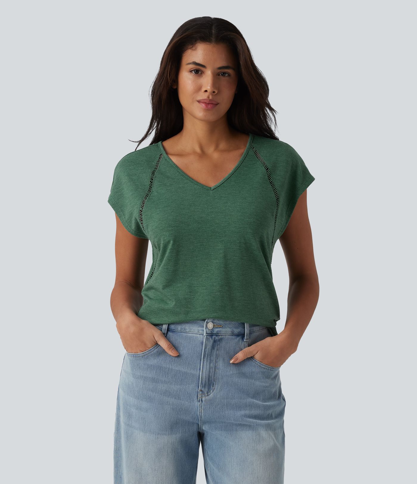 V Neck Batwing Short Sleeve Heathered Casual T-Shirt